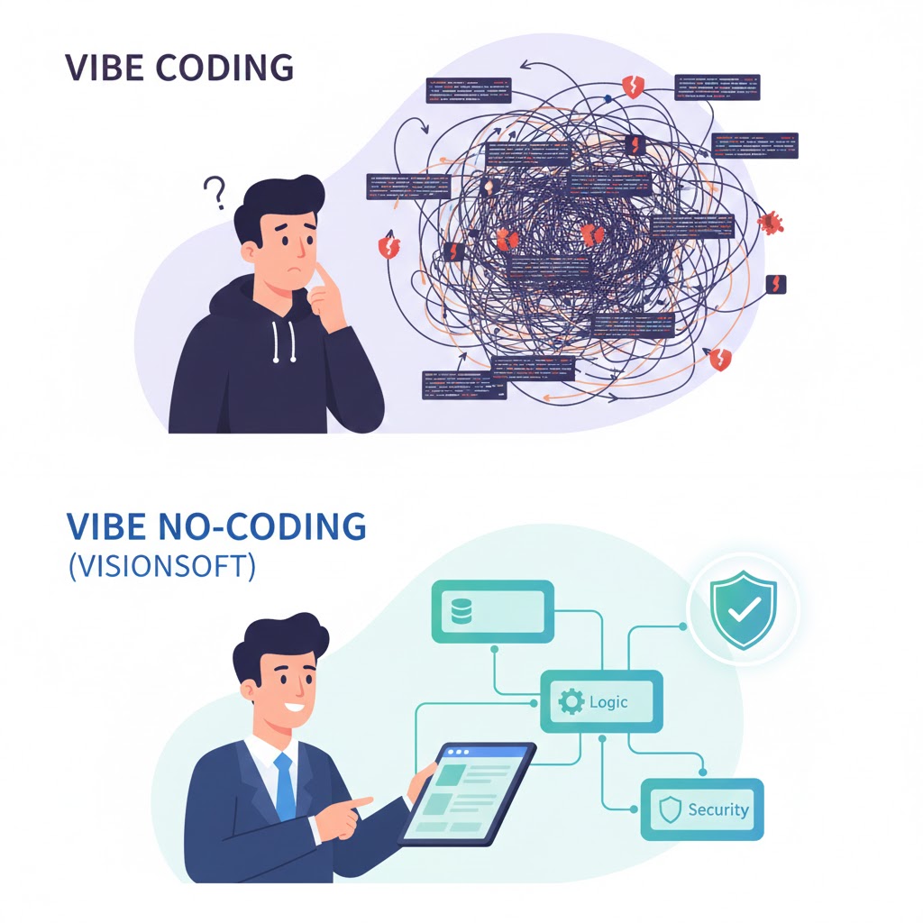 - La réponse Vibe No-Coding : Chez Visionsoft, nous prônons l’approche de l’Architecte. Nos solutions ne génèrent pas de syntaxe informatique obscure. Elles s’appuient sur une modélisation métier déclarative. Vous ne créez pas du code, vous structurez vos processus.